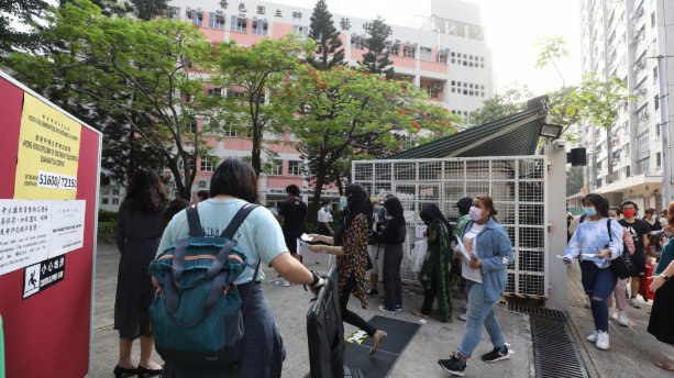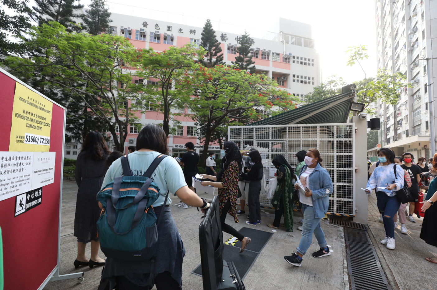 按照防疫規定,各個考場在開考前40分鐘讓學生進入,門口設有消毒地氈通道,考生要行經紅外線體溫計,提交健康申報表後,才可進入試場。
