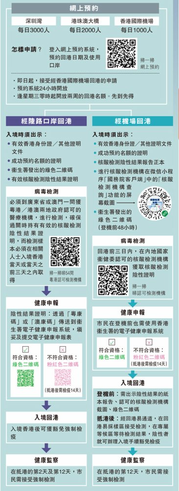 經機場返港的港人,須在機場進行病毒檢測並等候結果,回港後第12日也須接受檢測。經陸路回港的人士,須在第2及第12日做檢測。而透過「回港易」返港人士,若日後要赴內地及澳門,仍須遵從相關檢疫安排,包括隔離14日。