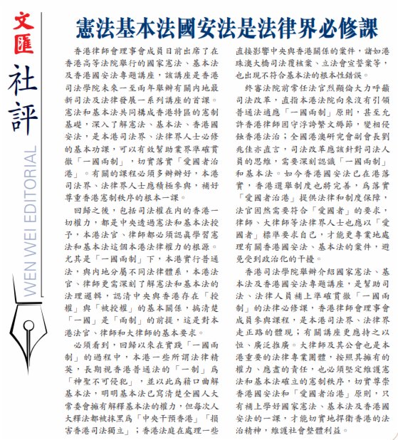 香港司法學院舉辦介紹國家憲法、基本法及香港國安法專題講座,是幫助司法、法律人員補上準確貫徹「一國兩制」的法律必修課,香港律師會理事會成員參與課程,是本港司法界、法律界走正路的體現;有關講座更應持之以恒、廣泛推廣。大律師及其公會也是本港重要的法律專業團體,按照其擁有的權力、應盡的責任,也必須堅定維護憲法和基本法確立的憲制秩序,切實尊崇香港國安法和「愛國者治港」原則,只有補上學好國家憲法、基本法及香港國安法的一課,才能切實地捍衛香港的法治精神,維護社會整體利益。