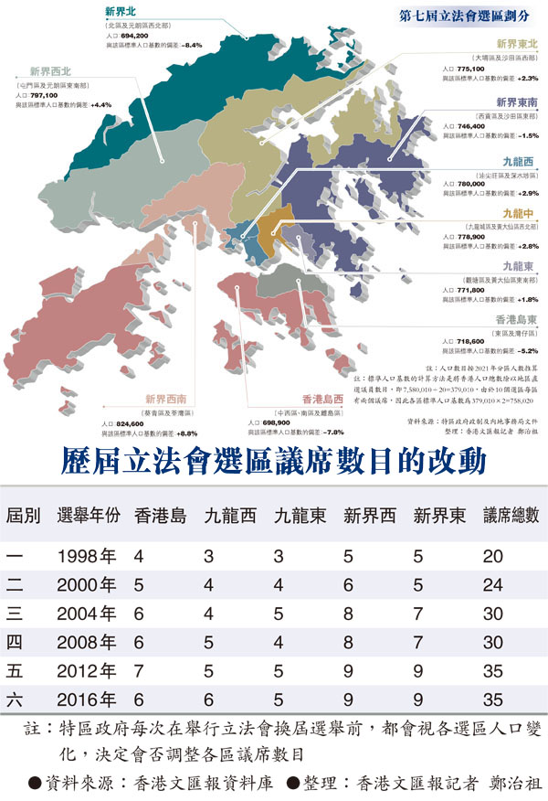 (香港文匯報記者 鄭治祖)特區政府早前公布完善選舉制度的條例修訂草案,建議以各區人口基數及不割裂選區為基礎,將原先的5個地方選區重新劃分為10區:新界5區、九龍3區、港島2區。每區採取雙議席單票制,各選出2名立法會議員。多名政界人士近日接受香港文匯報訪問時表示,坊間已對過往選區劃分爭議不斷,特區政府是次對選區劃分的建議符合實際情況。隨着選區細化,日後不同選區的候選人會更精準地針對該區居民所關注的議題;而重劃選區配合雙議席單票制,亦能避免再有激進分子以低比例票數當選。