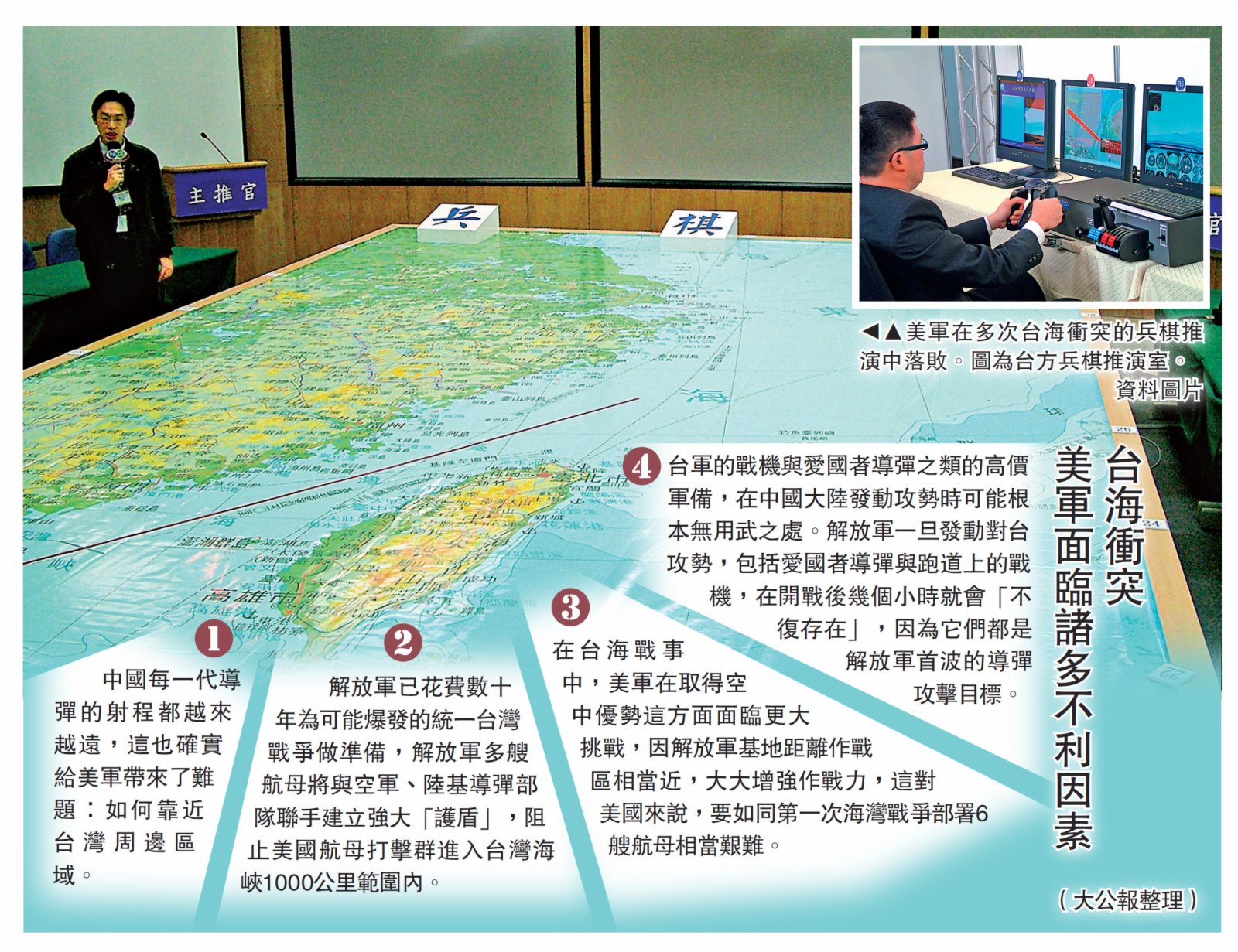 有外媒報道稱,美國空軍曾經利用現有資源進行兩次美中軍隊對抗模擬演習,兩次都被決定性地擊敗。去年美國再次進行台海模擬演習,並且贏了。因為這次美國為自己提供了大量尚未投產,甚至尚未開發的新技術和能力。可見,這樣的演習與現實相去甚遠。事實是,美國只能在夢中成功「保衛」台灣。