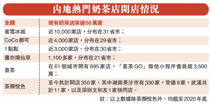 另一家連鎖茶飲品牌奈雪的茶,市傳近日更已向港交所提交上市申請,消息指其計劃集資5億美元。該品牌6年前在深圳開第一間店,2017年有44間店舖,到2020年9月,已增至422間,覆蓋內地61個城市,香港及日本各有一間,號稱已成為年輕人的潮流標誌。