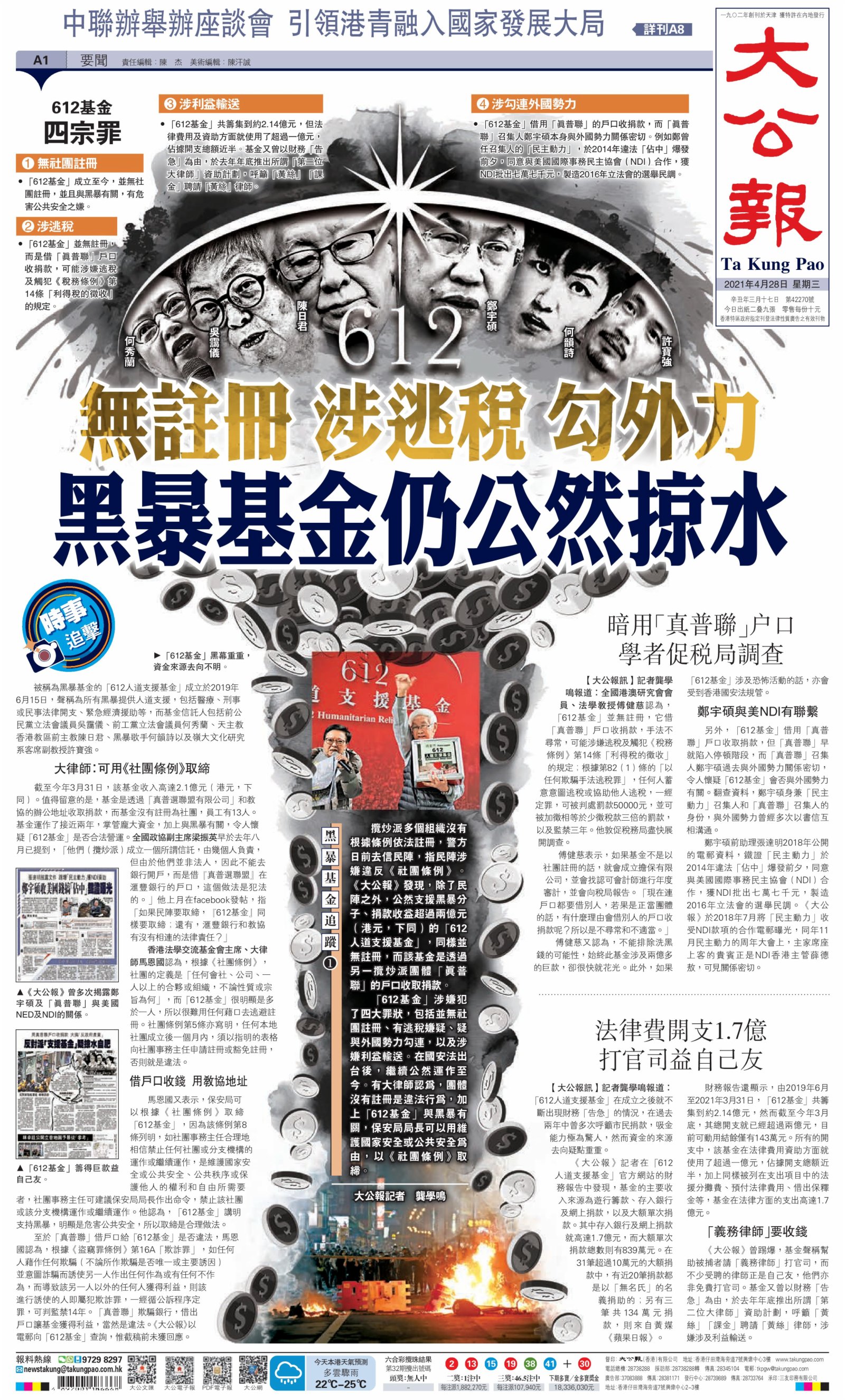 截至今年3月31日,該基金收入高達2.1億元(港元,下同)。值得留意的是,基金是透過「真普選聯盟有限公司」和教協的辦公地址收取捐款,而基金沒有註冊為社團,員工有13人。基金運作了接近兩年,掌管龐大資金,加上與黑暴有關,令人懷疑「612基金」是否合法營運。全國政協副主席梁振英早於去年八月已提到,「他們(攬炒派)成立一個所謂信託,由幾個人負責,但由於他們並非法人,因此不能去銀行開戶,而是借『真普選聯盟』在滙豐銀行的戶口,這個做法是犯法的。」他上月在facebook發帖,指「如果民陣要取締,『612基金』同樣要取締;還有,滙豐銀行和教協有沒有相連的法律責任?」