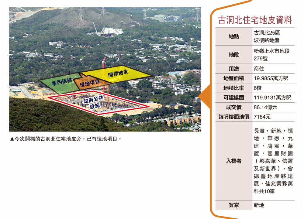 新界粉嶺北及古洞北兩新發展區,政府由提出研究至有首幅官地出售已近20年,該幅古洞北商住用地,上周截標時,吸引15家實力雄厚的本地及內地發展商,以獨資或組財團方式入標。業界已預料反應熱烈,並預測地皮估值可高達60億元,然結果仍出人意料之外。地政總署公布,該幅古洞25區商住宅地,由出價最高的新地旗下鉅置有限公司中標,成交價達86.14億元,土地批租期為50年。