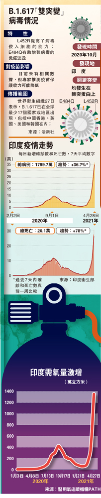 印度新冠疫情今年初有所緩和,但感染性更強的「雙突變」變種病毒B.1.617擴散,加上全國上下對防疫的放鬆,令形勢再度升溫。28日,印度衞生當局宣布過去24小時內新增36萬宗確診,再刷新最高紀錄,也是連續第7天確診破30萬,令總確診逼近1800萬;同日新增3293人死亡,累計逾20萬人已喪命。