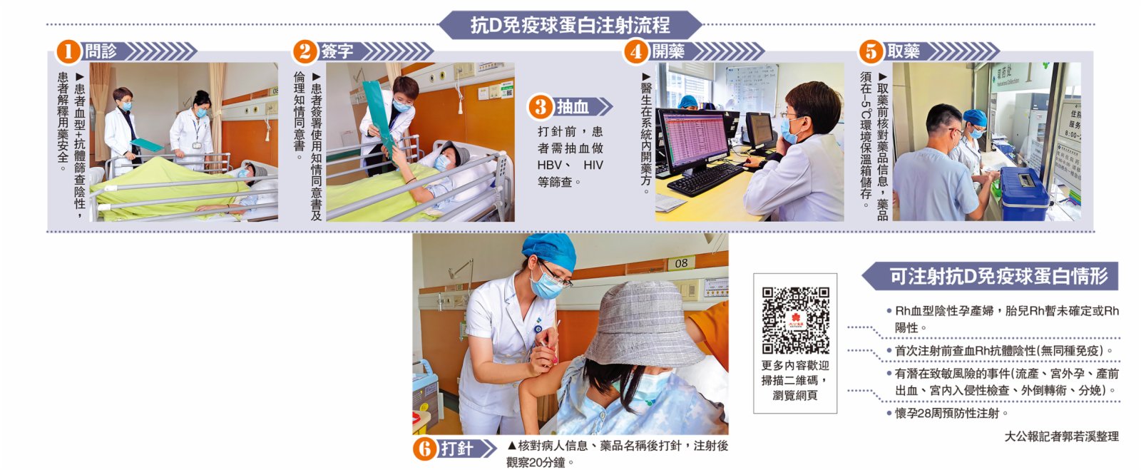 29日上午11時,港大深圳醫院婦產科王潔顧問醫生為楊女士完成了打針前的問診、解釋用藥安全及注射後隨訪等工作。王潔在接受大公報記者採訪時表示,抗D免疫球蛋白是「熊貓血」媽媽們的「救命藥」,一般需要打兩針,第一針注射時間為懷孕28周,第二針需分娩72小時內注射。「抗D免疫球蛋白能破壞母體血液的Rh-D抗原,抑制母體血液中Rh(D)抗體,從而可預防Rh的異型免疫反應。」