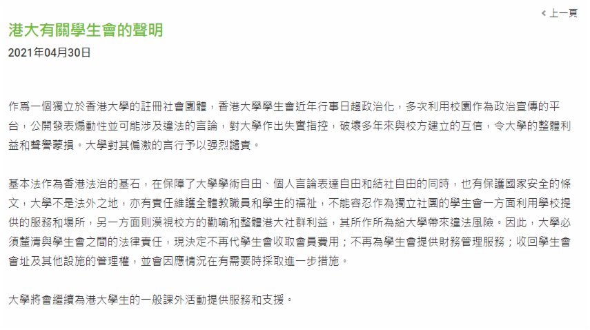 香港大學在聲明中指出,基本法作為香港法治的基石,在保障了大學學術自由、個人言論表達自由和結社自由的同時,也有保護國家安全的條文,大學不是法外之地,亦有責任維護全體教職員和學生的福祉,不能容忍作為獨立社團的學生會一方面利用學校提供的服務和場所,另一方面則漠視校方的勸喻和整體港大社群利益,其所作所為給大學帶來違法風險。因此,大學必須釐清與學生會之間的法律責任,現決定不再代學生會收取會員費用;不再為學生會提供財務管理服務;收回學生會會址及其他設施的管理權,並會因應情況在有需要時採取進一步措施。