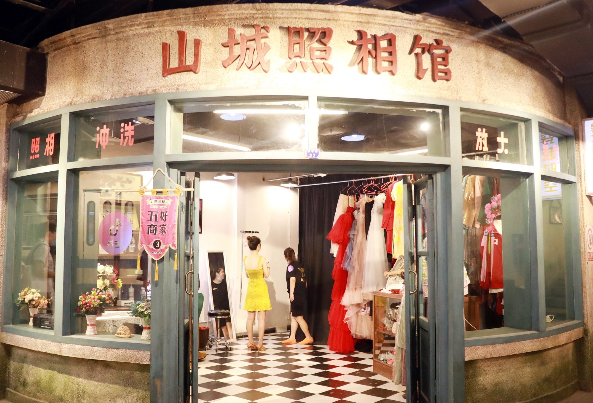 從人頭攢動的洪崖洞觀景平台乘觀光電梯至5樓,電梯門打開的一瞬間,時光被拉回到上世紀80年代。「山城照相館」里泛黃的老照片讓人回到過去,一輛永久牌單車靠在路邊,古樸的站台旁停着一輛「觀音橋至解放碑」復古5路電車。老式理髮店轉椅和燙頭機、青蛙垃圾箱、撥號座機電話、縫紉機等歲月小物件,潛移默化中把遊客代入到80年代中。