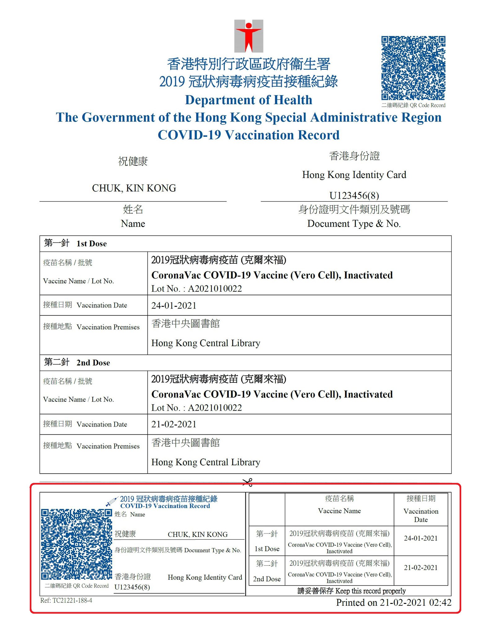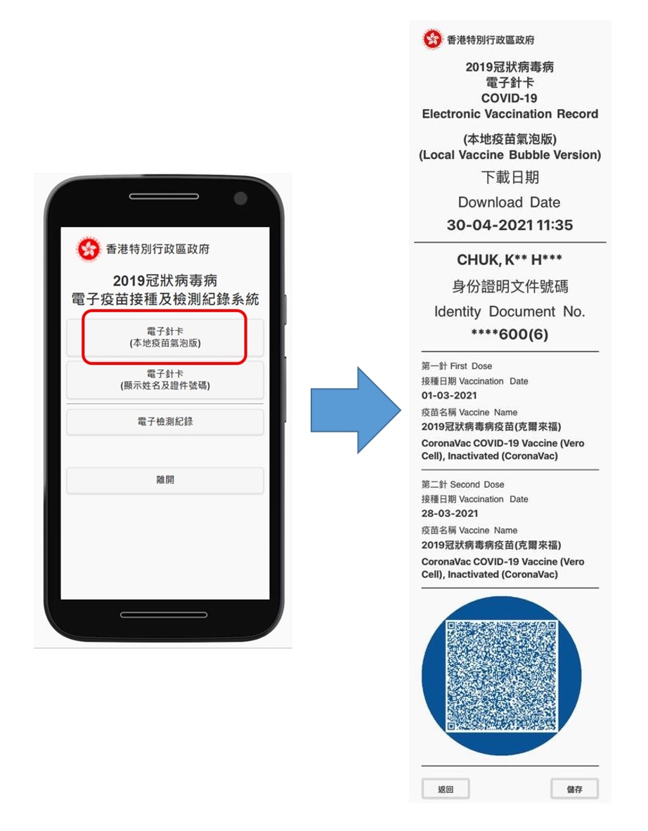 資科辦解釋,針卡上的二維碼載有市民的疫苗接種資料,同時亦是防偽特徵。因為二維碼使用了數碼簽署技術,令二維碼內的資料不能篡改,包括接種者的姓名、身份證明文件號碼以及相關接種記錄。這技術可確保有關記錄真確無誤,又無需連接任何系統或查核中央數據庫。
