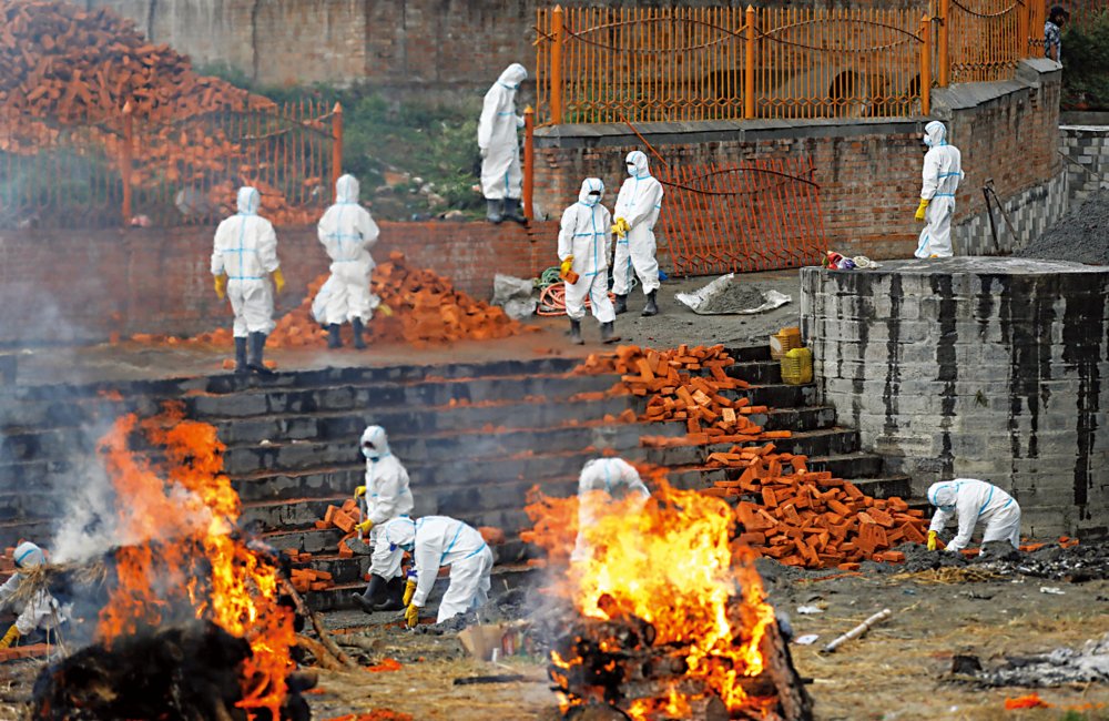 尼泊爾衞生部長表示,當前不只是病毒傳播失控,重症比例也隨之上升了。入院患者中有17%要進ICU,火葬場亦超負荷運轉。在加德滿都平均每天有超過20人染疫離世,為降低感染風險,當局要求患者遺體只能集中火化。而該火葬場每天最多能負荷16場火葬,工作人員不得不露天架起柴火堆,舉行集體火葬。