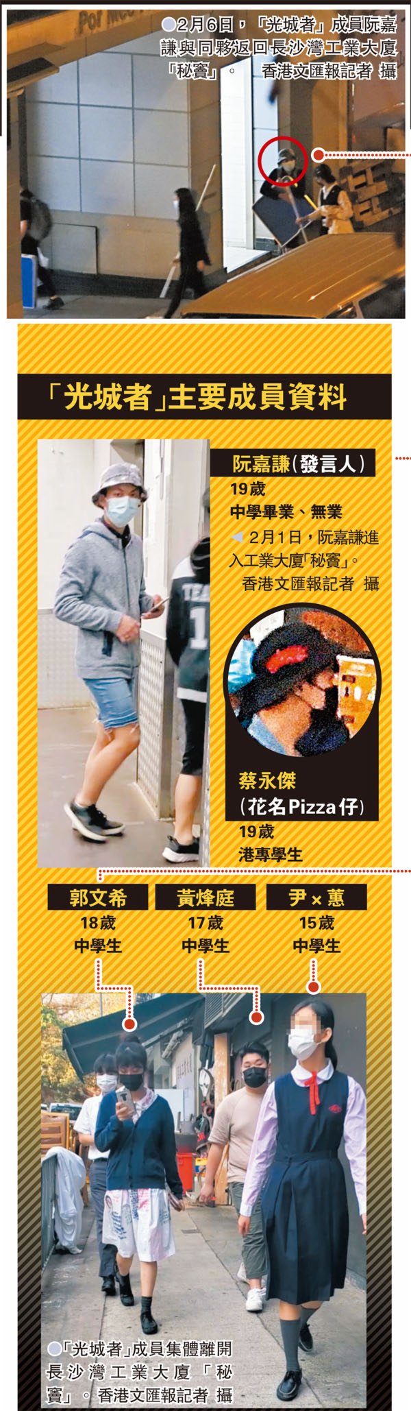 香港文匯報記者還發現,跟「大佬」進出「光城者」工廈「秘竇」的兩名少女成員,是經常在街站嗌咪的中六女生郭文希。據了解,郭文希兩年前在黑暴活動中結識阮嘉謙,當時她讀中四,去年底跟隨阮嘉謙籌組「光城」。