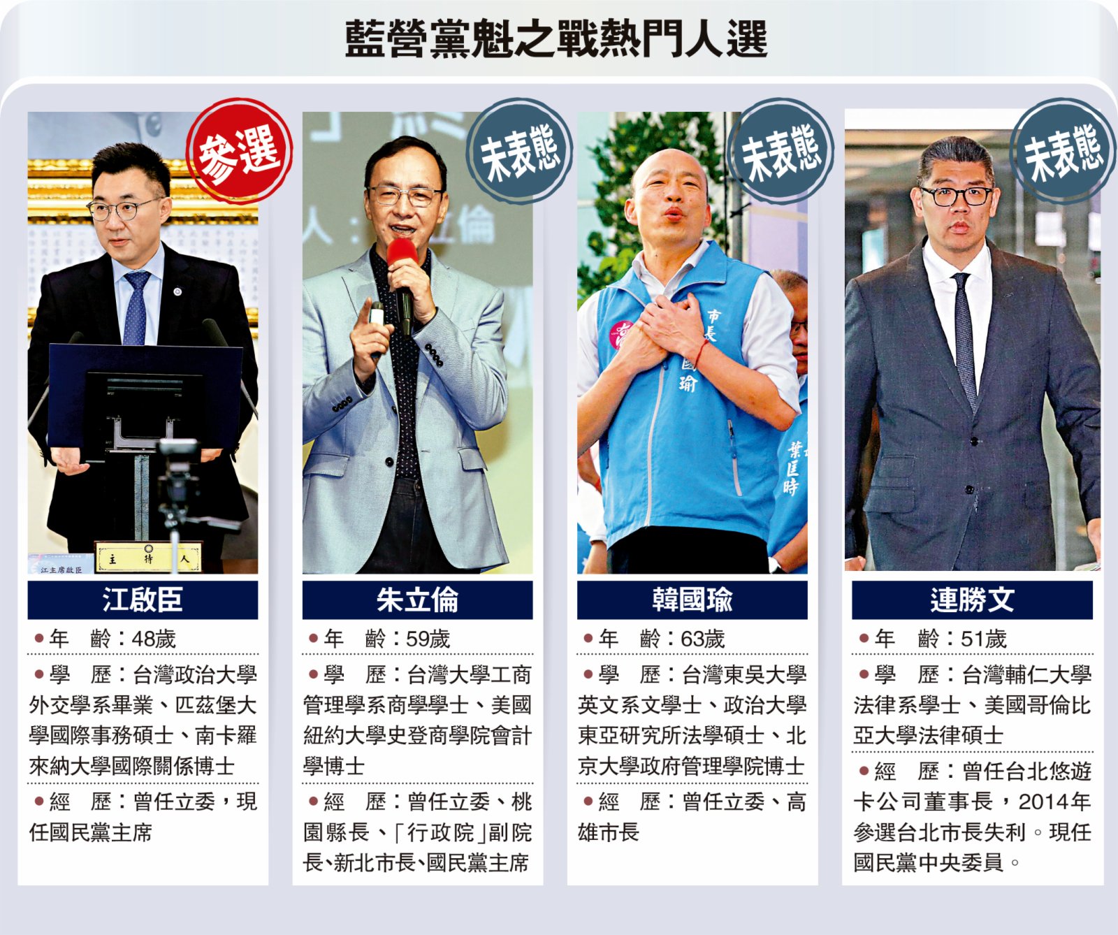 中國國民黨將於7月24日改選黨主席。在一眾熱門人選當中,目前只有現任黨主席江啟臣表態爭取連任,前新北市長朱立倫、前高雄市長韓國瑜和國民黨智庫副董事長連勝文仍未表態,三人動向將牽動黨主席戰局。島內輿論指出,有意參選者不應再盤算局面,而應早日宣布要選或是不選,若真的願意參選、承擔,就應該花時間向黨員論述理念,以及說明到底要把國民黨帶往哪裏,如此才有助國民黨贏得2022年地方選舉,甚至2024年大選。