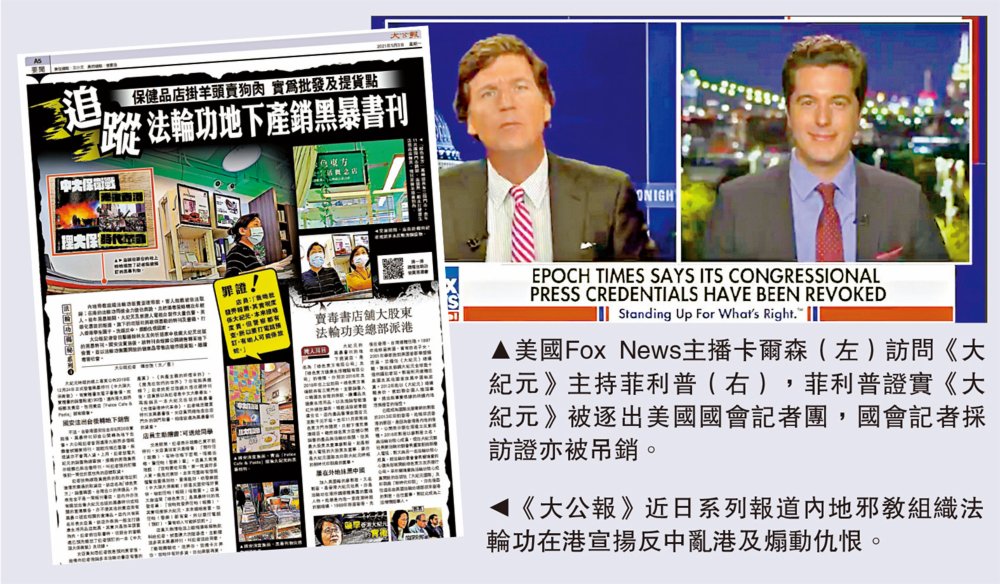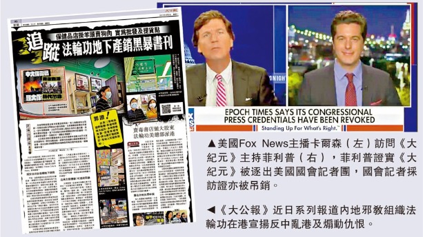 【大公報記者 黃浩輝(文) 李斯達(資料)】《大公報》連日報道內地邪教組織法輪功在港宣揚歪理邪說、反中亂港及煽動仇恨,荼毒年輕人,其喉舌《大紀元》最近在美國亦被用完即棄。5月5日《霍士新聞》(Fox News)等多家媒體報道,《大紀元》已被逐出美國國會記者團,記者採訪證已被吊銷。該份「毒報」的美國主持人在接受美媒體查詢時亦證實,《大紀元》不獲允許進入美國國會採訪。