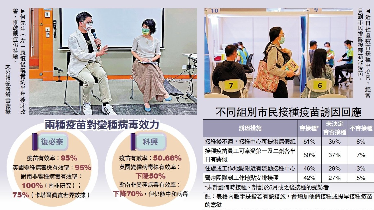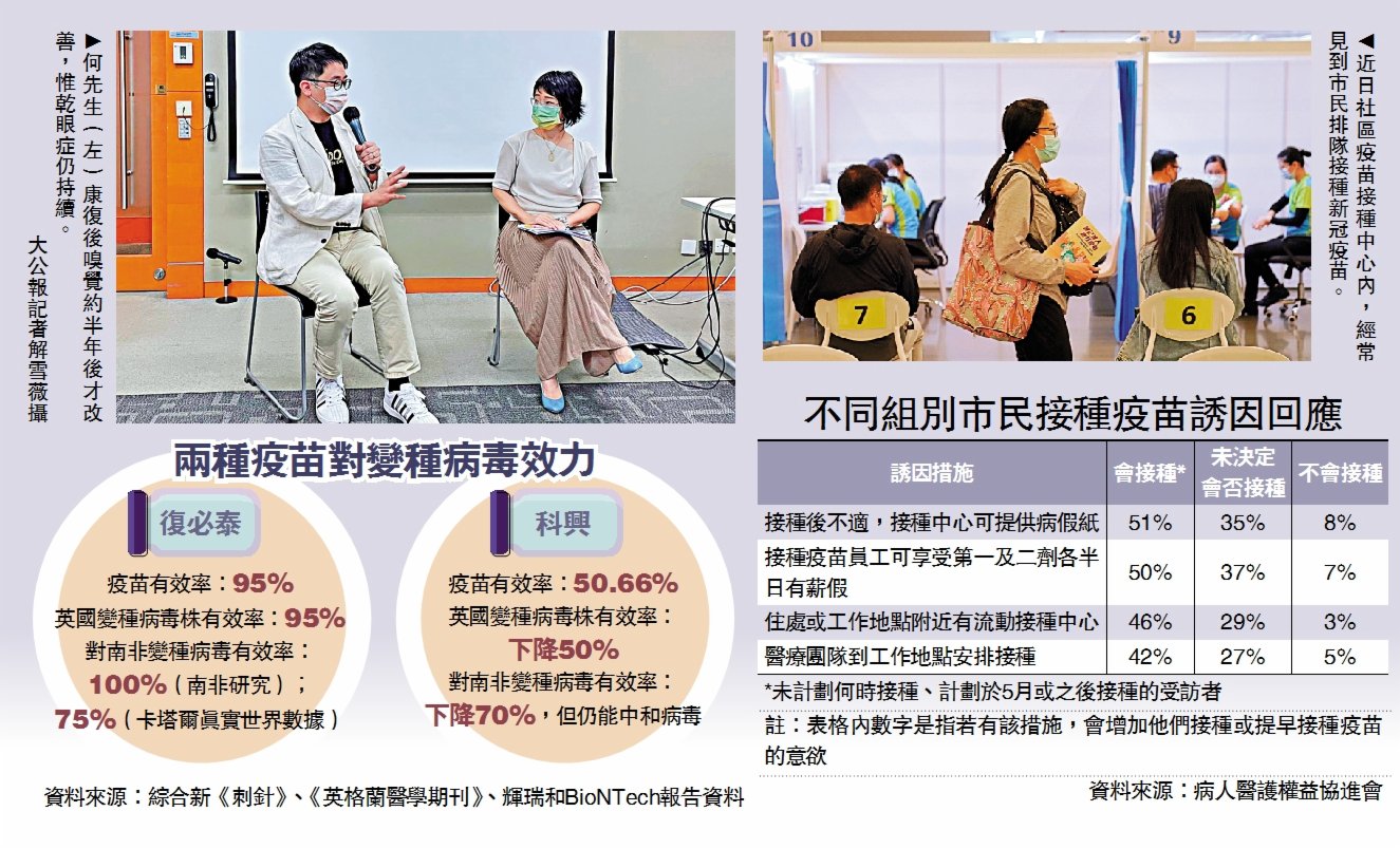 何先生說,透過長達半年的穴位刺激、針灸治療,加上香水療法等,味覺、嗅覺情況終獲改善,但仍然有乾眼症。他提醒年輕人切勿自以為免疫力好強,對新冠病毒掉以輕心,「住院期間見過有年輕人住院一個月,都未能出到院。」他稱確診後已進一步提高防疫意識,第一時間接種疫苗,「我是首批接種疫苗的人,家人都已全部接種。」變種病毒肆虐,他呼籲大家更應接種疫苗,保護自己和家人。