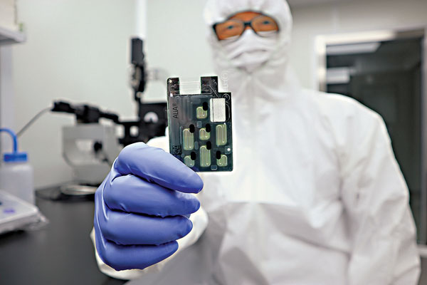 他解釋,微流控芯片上有7個設有內置泵試劑液槽,每款試劑對應特定的疾病。當芯片插入ALiA後,檢測程序會自動運行,控制內置泵的膨脹及閥門開關,以「推送」出試劑液體,精準高達每秒10納升。試劑液體及體液樣本會經過獨特的「蛋白微陣列」反應區,再由ALiA「解讀」蛋白陣列產生的熒光訊息,確定疾病。
