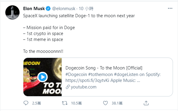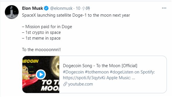 大公文匯全媒體報道,太空探索科技公司(SpaceX)明年第一季度將啟動「DOGE-1登月任務」,外媒當地時間9日報道,公司將接受客戶以加密貨幣狗狗幣(Dogecoin)作為支付貨幣。