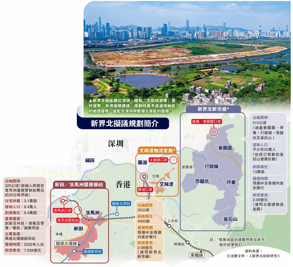 (大公報記者 方學明)新界北研究獲立法會發展事務委員會支持「上馬」。佔地逾320公頃的新田/落馬洲發展樞紐將率先展開勘察研究及詳細設計,目標2025年展開建造工程,料可提供3.1萬個住宅單位,創造6.4萬個就業職位,首批居民及企業可在2032年遷入。