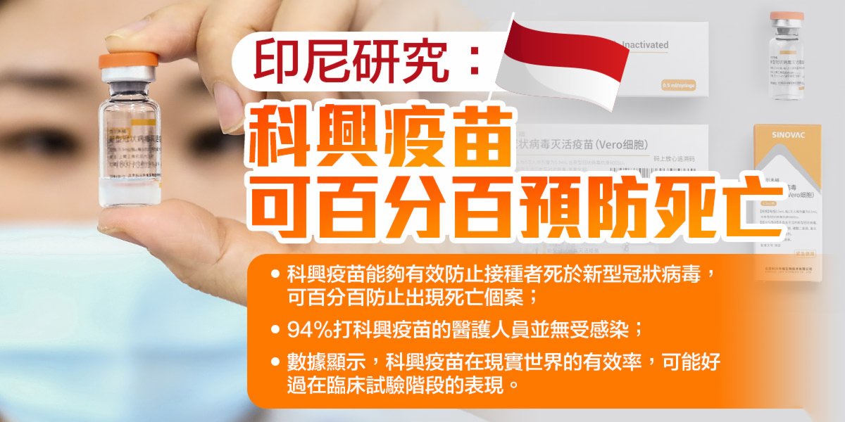 大公文匯全媒體報道,印尼近期一項研究顯示,中國科興疫苗能夠有效防止接種者死於新型冠狀病毒和住院。雅加達逾2.5萬名醫護人員早前接種完兩劑科興疫苗,研究顯示完成接種7天後,已經可百分百防止出現死亡個案,預防住院的成效亦達到96%。