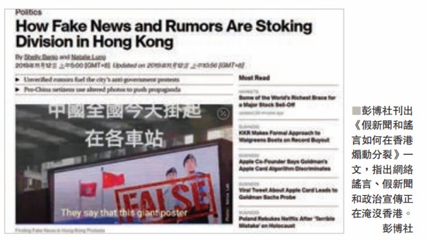 彭博社曾在文章中提及一些網上流傳消息,包括「周梓樂是被附近的防暴警察推下樓」「警察阻攔救護車拖延搶救時間」等。文章還稱,近日針對特區政府的謠傳依然層出不窮,包括稱特區政府命令警察隨意對示威者開實彈槍、設置銀行提款限制、動用緊急法關閉金融市場和學校等,特區政府亦對此一一澄清。但虛假信息的氾濫,讓香港市民對政府的信心亦有所減弱。