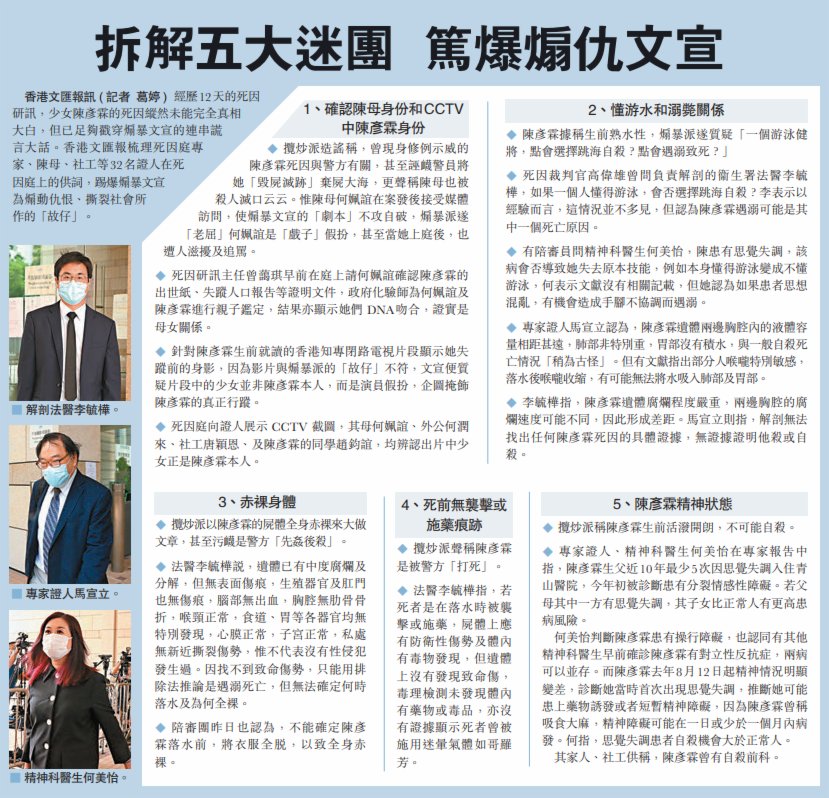 在這一基礎上,我們或許可以推測,陳彥霖的死因可能與其生活受挫遭遇情緒波折有關,但由於缺乏能直接證明其自殺的證據,出於法律上的嚴謹,陪審團亦未裁定她「死於自殺」,只能裁定她因精神紊亂或遇溺等因素而「死於意外」,或者因證據不足以推斷死因而裁定「存疑」。