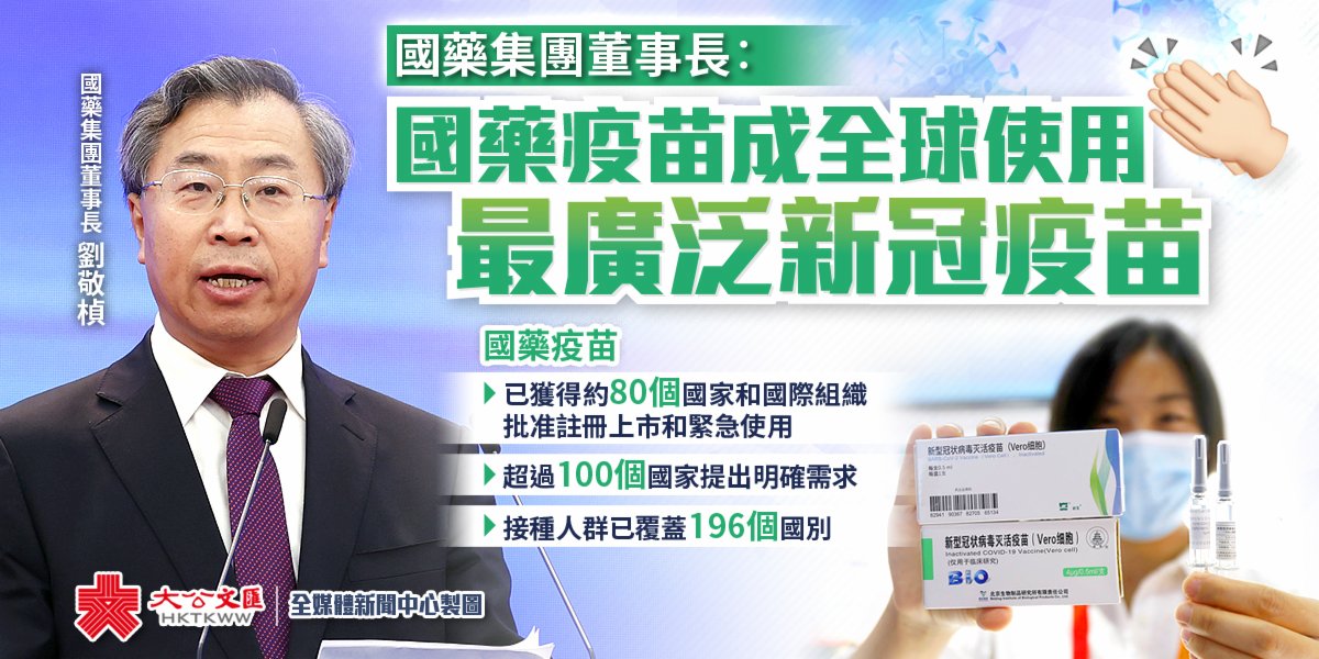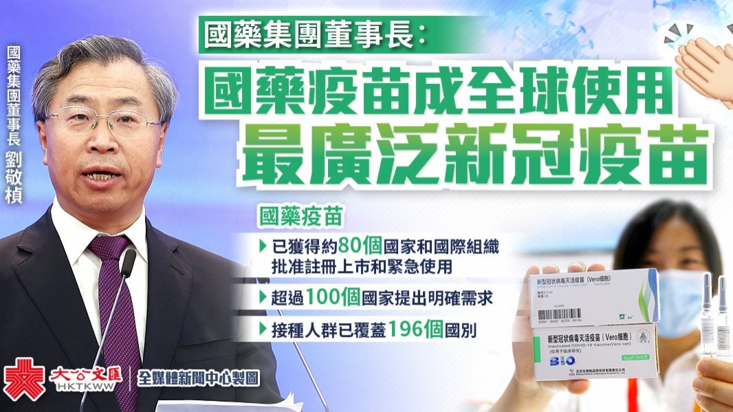 大公文匯全媒體報道,「走向世界的中國國藥新冠疫苗研討會」今日(13日)在上海召開,國藥集團董事長劉敬楨在此次研討會上提到,截至目前,國藥新冠疫苗已獲得約80個國家和國際組織批准註冊上市和緊急使用,超過100個國家提出明確需求,接種人群已覆蓋196個國別,成為全球使用最廣泛、使用效果最好的新冠疫苗。