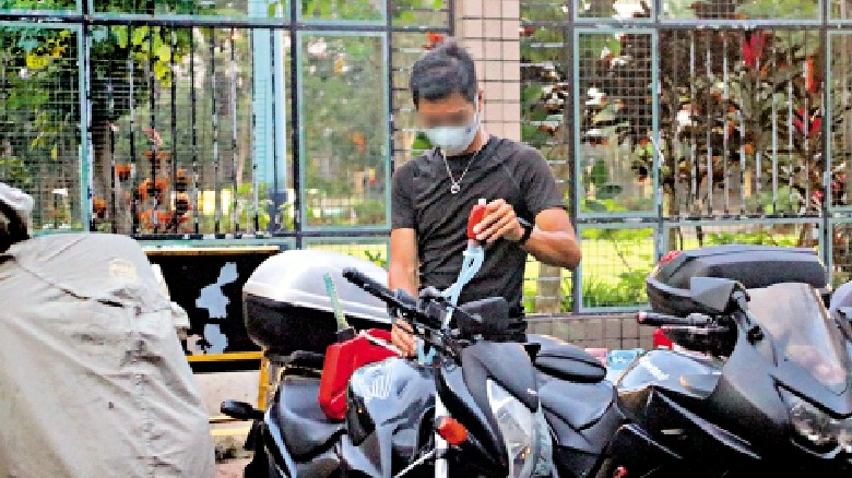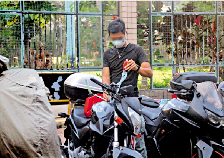 除了「骨位」被霸佔及「學神」在路面穿梭的亂象,記者還發現有人公然在街頭為電單車入油。本周三晚上近七時,一名「學神」與另一男子分別騎車到大球場徑,並將車停在「骨位」對面,該男子落車後便從車尾箱拿出膠桶和油泵,為至少三部電單車入油,其間該男子不停四處張望,約10分鐘後加完油,便迅速將膠桶和油泵放回車尾箱,並與同伴騎車而去。