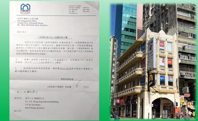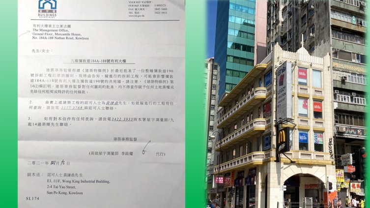 有關的唐樓屬單邊物業,位於彌敦道與柯士甸道交界,早年曾翻新。油尖旺區議員陳嘉朗和賀卓軒昨日(14日)向古物古蹟辦事處及古物諮詢委員會發信,指接獲市民告知,現場三級歷史建築古蹟獲最近獲建築署批准一份整幢拆卸工程的建築圖則,並擬進行拆卸工程。區議員詢問古蹟辦和古諮會是否已知悉有關的拆卸工程申請、有否聯絡相關業主、會否就拆卸工程採取阻止行動,和會否宣布有關建築物為暫定古蹟,暫時避過拆卸風險。