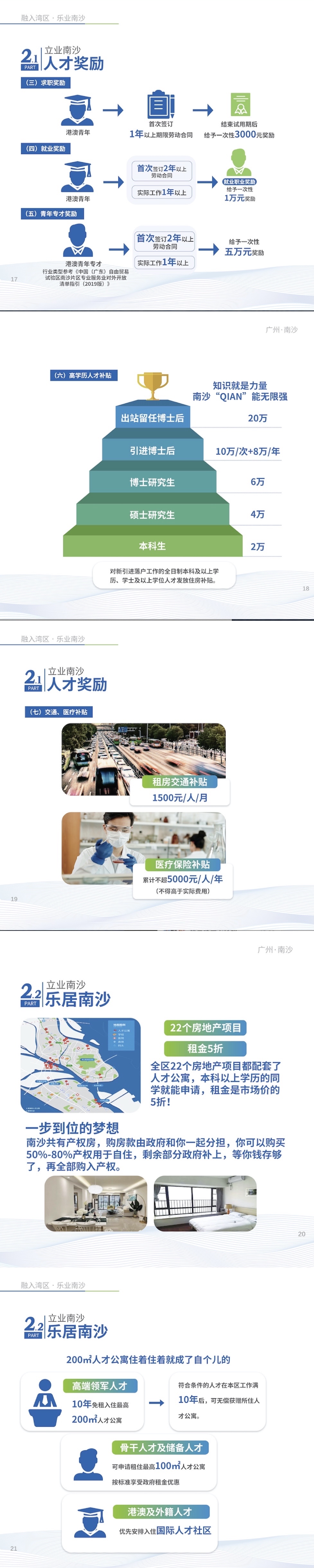 為鼓勵港澳青年人才來南沙就業發展,此前南沙出台實施了《廣州南沙新區(自貿片區)鼓勵支持港澳青年創新創業實施辦法(試行)》,聚焦港澳青年學業、就業、創業與「食住行」等現實需求。根據實施辦法,為參與實習計劃的港澳青年免費提供實習崗位、住宿、用餐、交通、保險等,對到南沙區求職的港澳青年給予一次性3000元獎勵;與用人單位首次簽訂2年以上期限勞動合同的港澳青年給予一次性1萬元獎勵;從事法律、會計、稅務、諮詢與調查服務、建築工程、設計服務行業,並取得由香港或澳門特別行政區政府有關行業主管部門或合法專業團體頒發執業資格證書的港澳青年專才,到南沙執業可以拿到一次性5萬元獎勵;同時還有每人每月1500元租房交通補貼,以及南沙獨有的每年最高5000元的醫療保險補貼等。