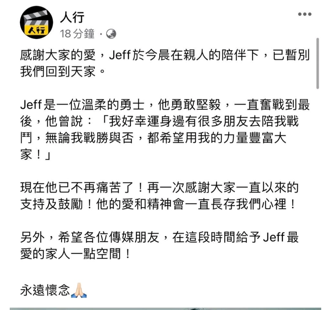 (大公文匯網記者 陳惠芳)前無綫藝員陳積榮(Jeff)今日(15日)不敵肺癌病逝,終年38歲。「人行」在facebook專頁透露Jeff去世消息。「感謝大家的愛,Jeff於今晨在親人的陪伴下,已暫別我們回到天家。Jeff是一位溫柔的勇士,他勇敢堅毅,一直奮戰到最後。」留言中指Jeff曾說:「我好幸運身邊有很多朋友去陪我戰鬥,無論我戰勝與否,都希望用我的力量豐富大家!現在他已不再痛苦了!再一次感謝大家一直以來的支持及鼓勵!他的愛和精神會一直長存我們心裏!」