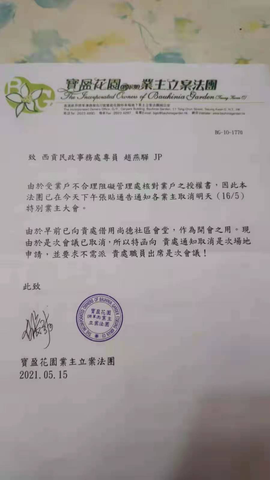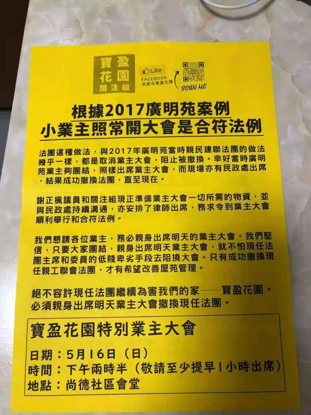 昨日(5月15日)寶盈法團經咨詢律師意見後,基於保障業主之私穩及屋苑範圍之秩序問題,法團最終作出取消大會的艱難決定。而謝姓議員則扮曬專家,稱程序不符合相關法律要求,盡管夜深仍在屋苑門口用大聲公蠱惑街坊繼續參加已被取消的業主大會,完全無視業主參加非法集會,有可能墜入法網,惹上官非的後果,且眾多人員聚集參與未經授權的集會,明顯涉嫌違反「禁聚令」,行為自私。對於其提出的程序問題,現實情況是管理處已傳真及電郵致當區民政專員及民政處負責同事,告知因故取消今日(5月16日)法團會議,無須借用會議場地及派員參會的決定。對於謝姓議員支持的「寶盈花園關注組」昨夜上樓散發呼籲街坊參會的單張,管理公司已連夜洗樓收趙,避免業主誤墮法網!並已用 whatsapp 通知業戶,業主大會已因故取消,若前往尚德社區會堂聚集,有機會誤墜法網。