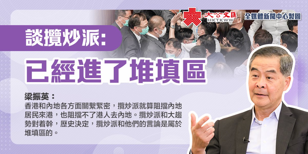 「如今每年香港婚姻註冊有約三分一是港人與內地人士通婚,這不僅是兩地人民自己的選擇,更是代表兩地融合是時代潮流。」梁振英強調,「攬炒派是和歷史潮流作對,歷史將決定他們是屬於堆填區。」