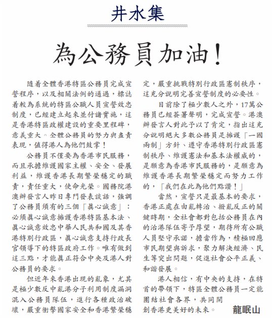 目前除了極少數人之外,17萬公務員已經簽署聲明,完成宣誓。港澳辦發言人對此予以了肯定,指出這充分說明絕大多數公務員是擁護「一國兩制」方針、遵守香港特別行政區憲制秩序、維護憲法和基本法權威的,是願意為香港市民服務的,是願意為維護香港長期繁榮穩定而努力工作的,「我們在此為他們點讚!」