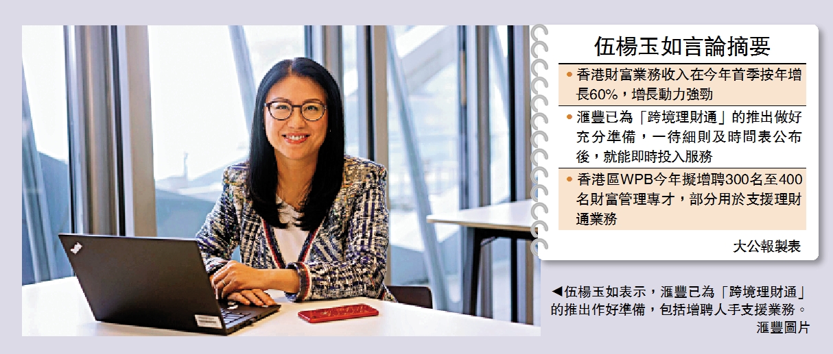 (大公報記者 黃裕慶)滙豐力拓亞洲區財富管理業務,香港是區內的主要市場之一。滙豐香港區財富管理及個人銀行業務主管伍楊玉如表示,香港區的發展潛力大,目標是在5年後,香港高淨值客戶的盈利可增加近1倍,而前線職員亦會相應增加大約1倍,預計今年新增300至400名財富業務專才,部分用作支援「跨境理財通」。對於理財通業務,滙豐目標是於本港市場進佔頭三位。