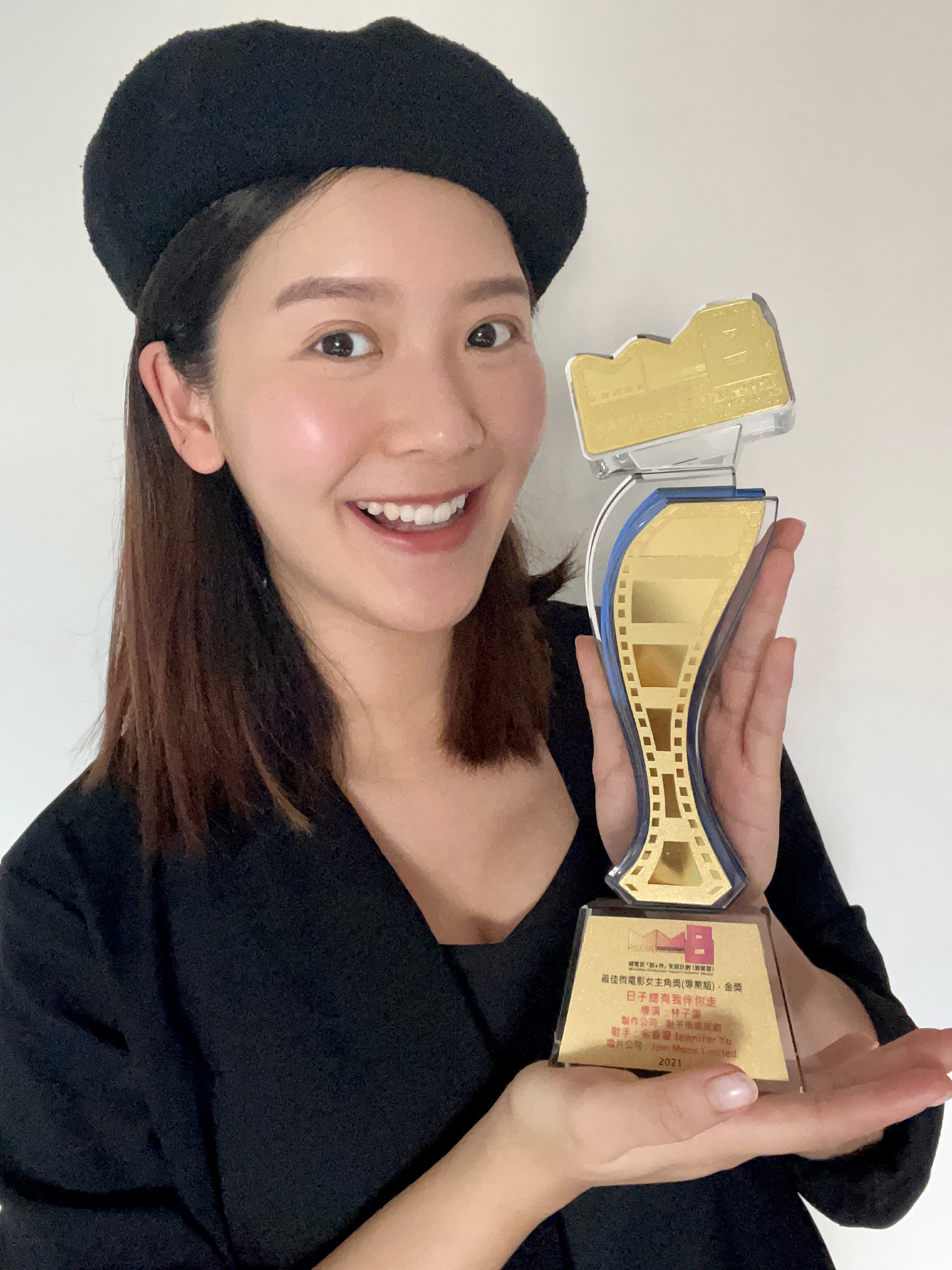 (大公文匯網記者 陳惠芳)余香凝(Jennifer)去年底與影后鮑起靜及潘燦良拍攝微電影《日子總有我伴你走》,她更憑該電影奪下「最佳微電影女主角」獎。由於疫情關係,是次微電影比賽未有舉行頒獎禮,而近日微電影女主角的獎座終於送到Jennifer手上。