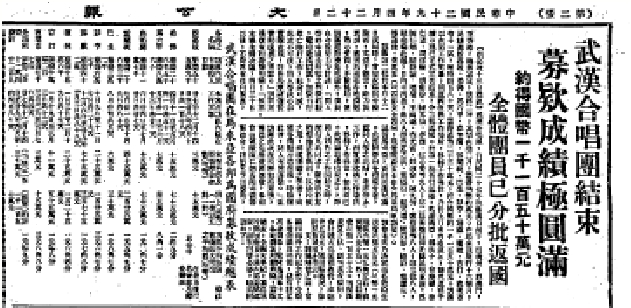 「武漢文化界職業界青年組織之武漢合唱團,男女團員一行二十六人,由團長夏之秋、黃椒衍暨領隊陳仁炳博士率領,已於昨午經廣州澳門抵港。該團在漢組織成立經已一年,對歌詠戲劇講演各工作,向極努力。近受武漢各界贊助,啟程前赴南洋各埠,義務表演,抗戰中之中國音樂戲劇,周前曾參加廣州募寒衣運動,演奏多次,刻下在港,有旬日逗留,並擬定期舉行音樂戲劇演奏。」