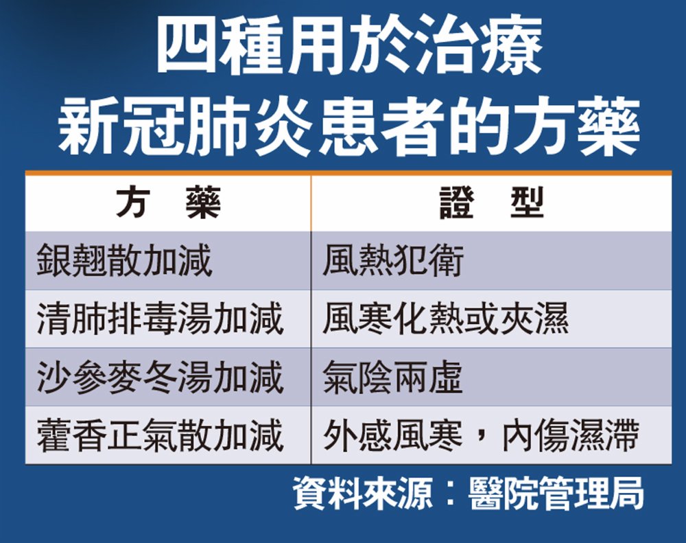 中醫診療計劃開展初期只有三種方劑,分別是「銀翹散加減」、「清肺排毒湯加減」、「沙參麥冬湯加減」,運作大約一個月之後,加入對外感風寒、內傷濕滯有一定作用的「藿香正氣散加減」。黃玲玲表示,「我們不會一成不變,專家小組會因應患者實際情況,作出適當調整。」