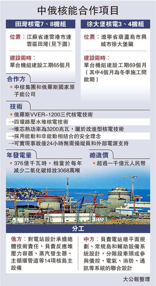 田灣核電站7號、8號機組和徐大堡核電站3號、4號機組是2018年6月兩國元首見證簽署的雙方核能領域一攬子合作協議中的重要項目,建成投產後年發電量將達到376億千瓦時,相當於每年減少二氧化碳排放3068萬噸。