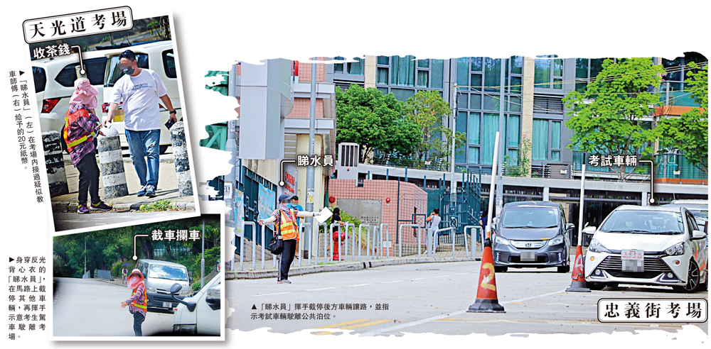 大公報記者連日追蹤發現,運輸署多個駕駛考試中心,皆有所謂「睇水員」打點,公然幫考牌「學神」截停及攔截路經車輛,甚至「提水」指導泊車,事後更做埋攝影師,替「師生」拍勝利合照。「睇水員」疑似集團式運作,事後會收20元「服務費」,據說是行內「潛規則」。山大斬埋有柴,每試場計料月入高達數萬元。