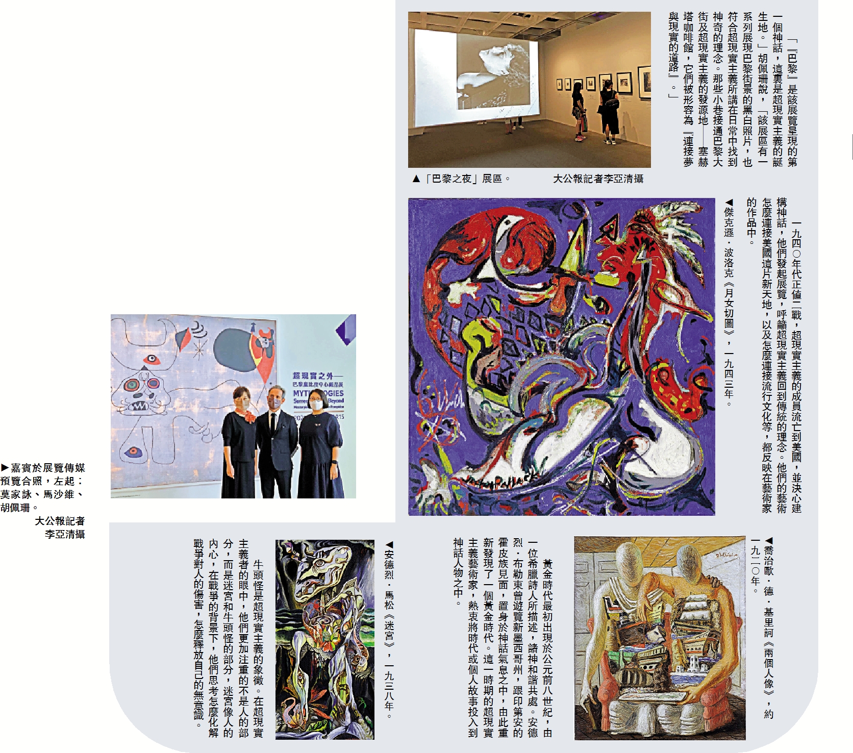 (大公報記者 李亞清)巴黎龐比度中心作為著名的文化藝術中心,館藏豐富。作為與龐比度中心繼2006年後的第二次合作,香港藝術館自今日起舉辦「超現實之外—巴黎龐比度中心藏品展」至9月15日,展出逾百件由龐比度中心收藏的超現實主義藝術家作品及文獻資料,包括繪畫、攝影、雕塑、文獻等,從神話角度出發,貫穿整個超現實主義的發展歷程。當中大部分作品是首次在香港展出。