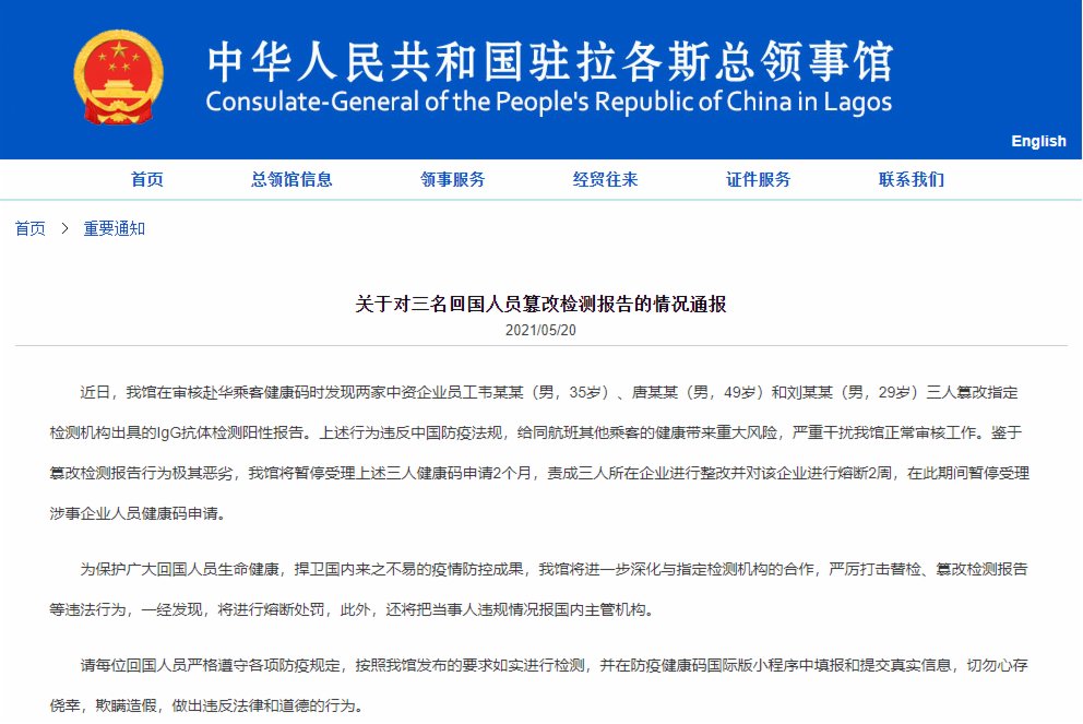中國駐拉各斯總領館網站5月20日發布了關於對三名回國人員篡改檢測報告的情況通報,全文如下: