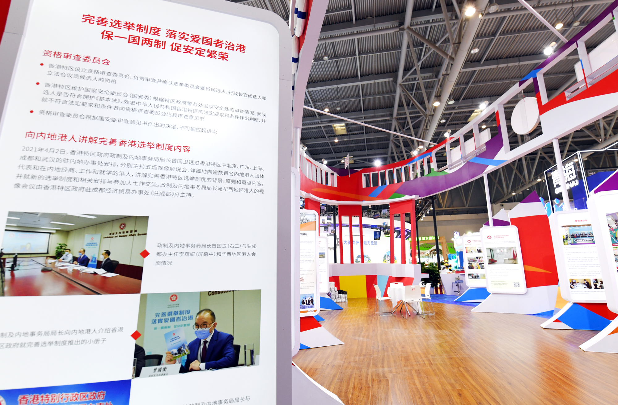 記者在現場見到,香港展位設有展板介紹香港特區政府駐成都經貿辦和重慶聯絡處的工作、粵港澳大灣區、《十四五規劃綱要》和「一帶一路」倡議下香港的機遇和優勢、香港人才入境計劃、人才清單、《基本法》及完善香港特區選舉制度、投資推廣等內容。