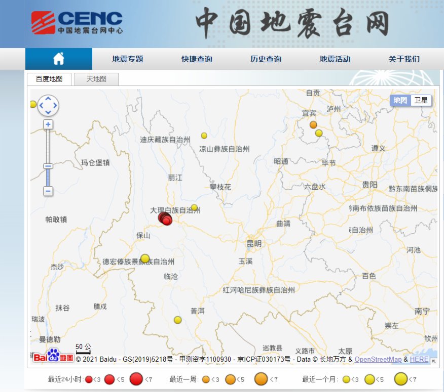 中國地震台網正式測定:05月21日22時03分在雲南大理州漾濞縣(北緯25.57度,東經99.93度)發生3.9級地震,震源深度8千米。