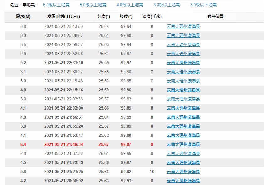 中國地震台網正式測定:05月21日21時48分在雲南大理州漾濞縣(北緯25.67度,東經99.87度)發生6.4級地震,震源深度8千米。