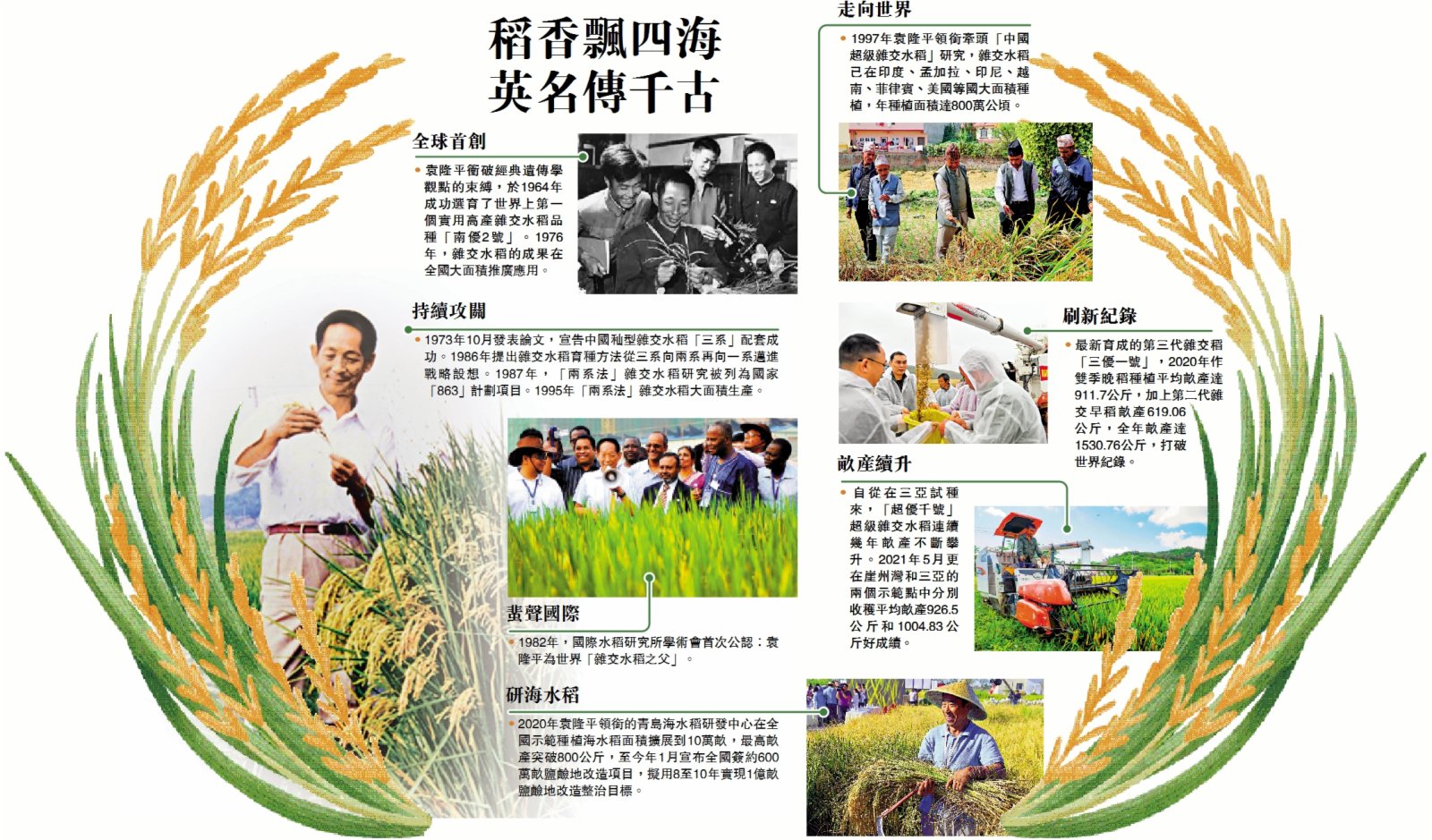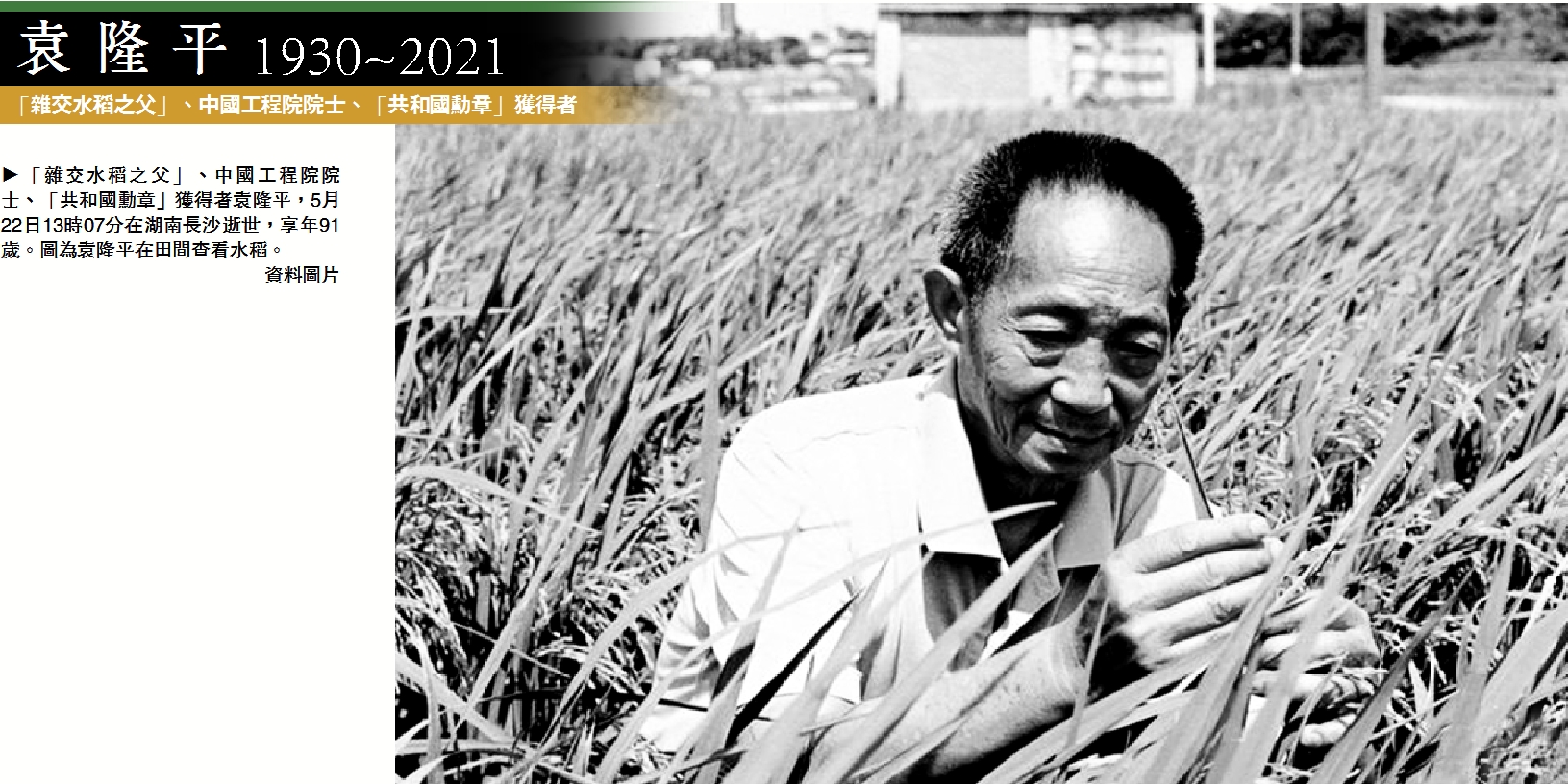 (大公報記者 劉凝哲、任芳頡)「雜交水稻之父」、「共和國勳章」獲得者、中國工程院院士袁隆平,因多器官功能衰竭,於5月22日13時07分在湖南長沙逝世,享年91歲。袁隆平心中一直有兩個夢想:「禾下乘涼夢」和「雜交水稻覆蓋全球夢」。從1961年7月,袁隆平在稻田中發現的第一株雜交稻,到如今造福全球逾80個國家的雜交水稻技術,袁隆平以驚人的科學成就向世界宣布:「中國完全能解決自己的吃飯問題,中國還能幫助世界人民解決吃飯問題。」當日下午,靈車抵達長沙明陽山殯儀館。