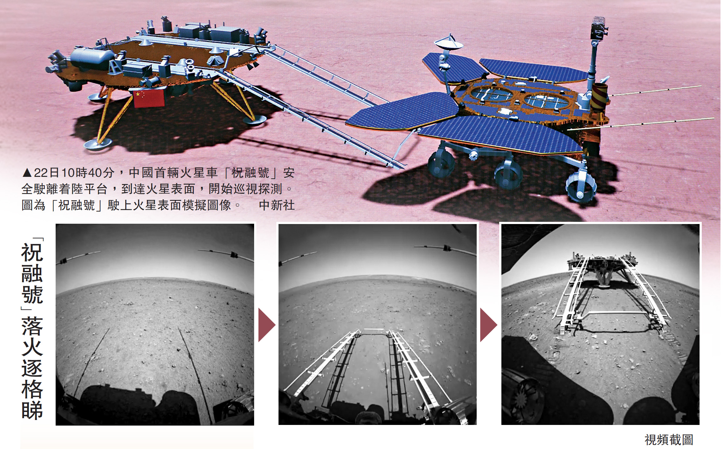 大公報綜合記者劉凝哲、新華社報道,記者從國家航天局獲悉,根據遙測數據判斷,5月22日10時40分,「祝融號」火星車已安全駛離位於烏托邦平原的着陸平台,到達火星表面,借助懸架減速自鎖裝置,爬坡下坎行動自如開始巡視火星。對於「火星是否存在過生命或能支持生命的環境」和「火星演化和太陽系的起源與演化」這兩個天問,「祝融號」將給出答案。「祝融號」亦設置「休眠」模式,來躲避火星上巨大沙塵暴,保證探測順利進行。