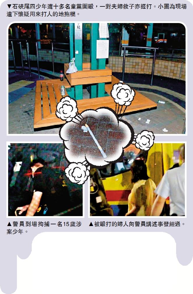 (大公報記者 黃浩輝、突發組)童黨問題日趨嚴重,連大人都被照打!早前石硤尾邨發生四名學生在石硤尾一屋邨的公園聊天時,突被10多名少年圍毆,其中最令人側目的是兩名家長驚聞兒子遭人欺凌後前往救援,詎料10多名惡霸未有收斂,更連「大人都打埋」。