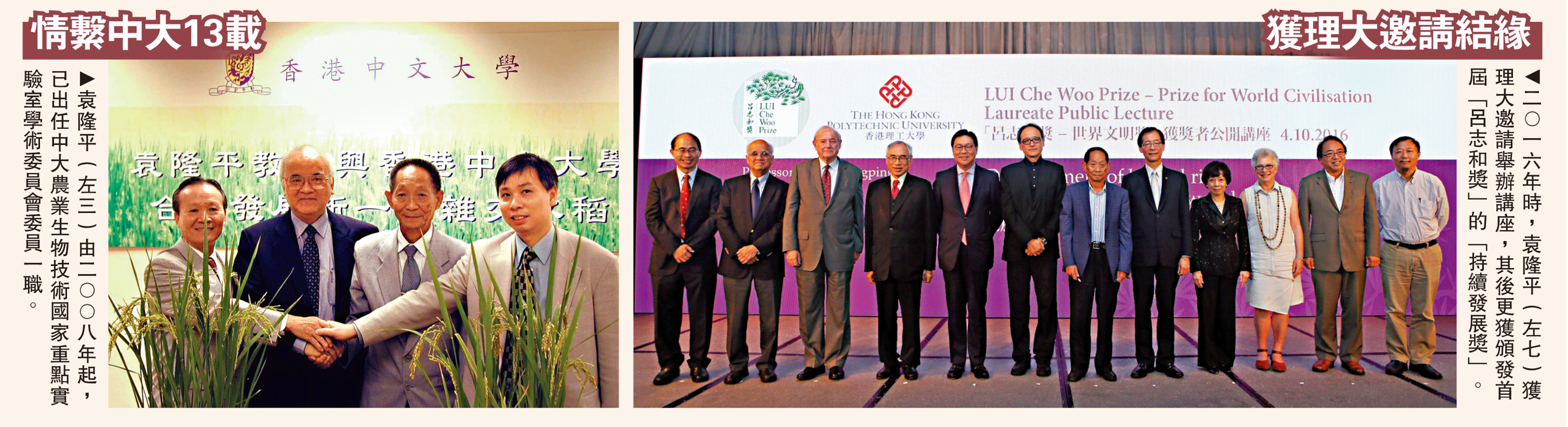 香港理工大學昨日亦在對《大公報》的回覆中透露哀悼之情。理大於2016年與呂志和獎有限公司攜手舉辦袁隆平院士的公開講座,題為「發展雜交水稻,保障糧食安全」。袁隆平當年獲頒發首屆「呂志和獎」的「持續發展獎」,以表彰他在加強保障世界糧食供應方面的傑出貢獻。