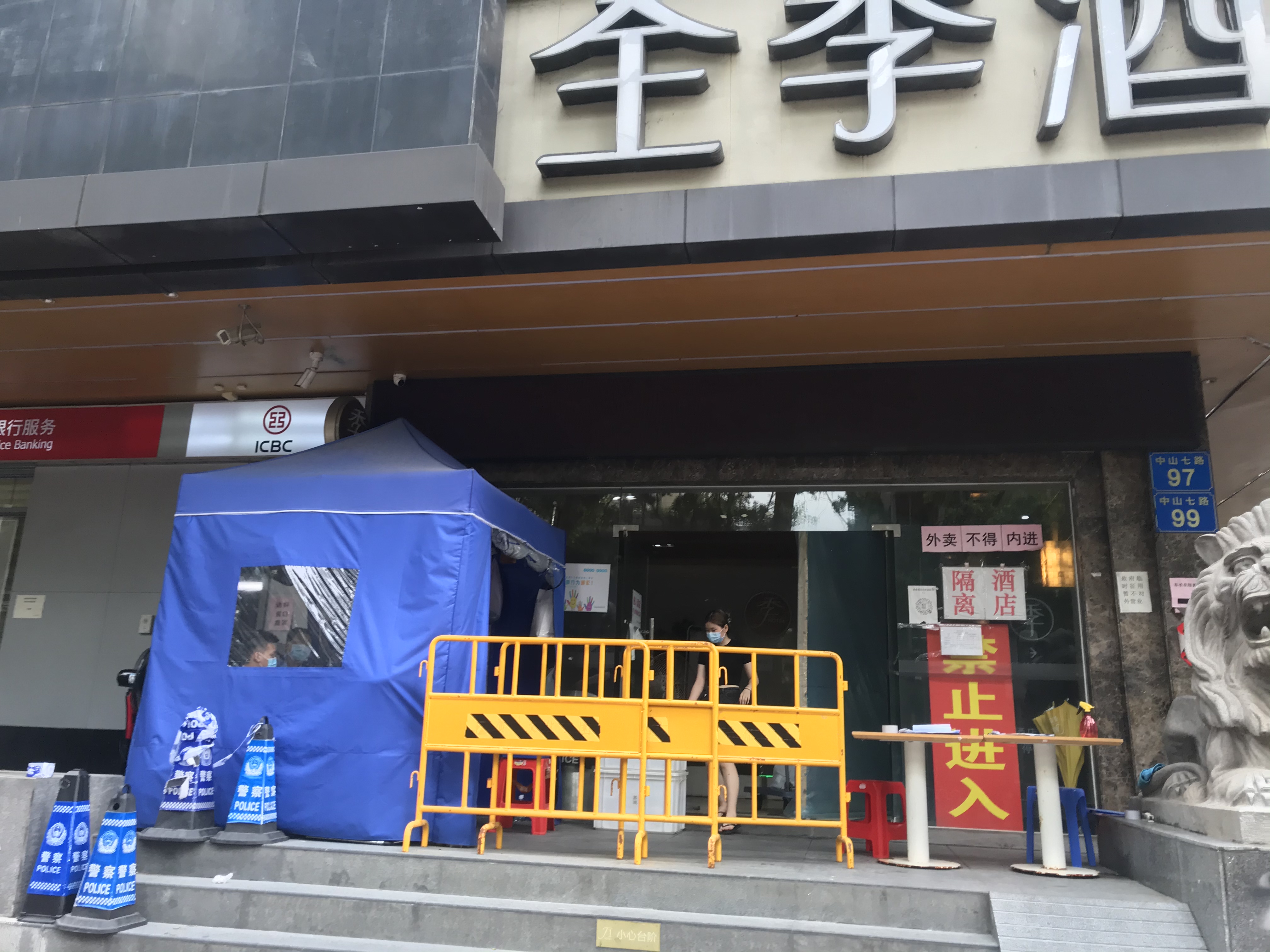 廣西的無症狀感染,官方通報只提及荔灣區隔離酒店,並未指出是具體哪一家。記者了解到,目前,廣州荔灣區至少有5家隔離酒店,分布在荔灣區的老城區和芳村片區。記者25日走訪發現,此次涉疫的「又一間茶點軒」,周邊至少有2家隔離酒店,其中,「速8酒店」與該茶樓相鄰,直線距離不足100米。酒店有工作人員出入,不時有外賣人員送餐到酒店門口。另外一家隔離酒店全季酒店,同樣有工作人員把守,其位置與「又一間茶點軒」、速8酒店在中山七路同一側,與茶樓直線距離約400米。