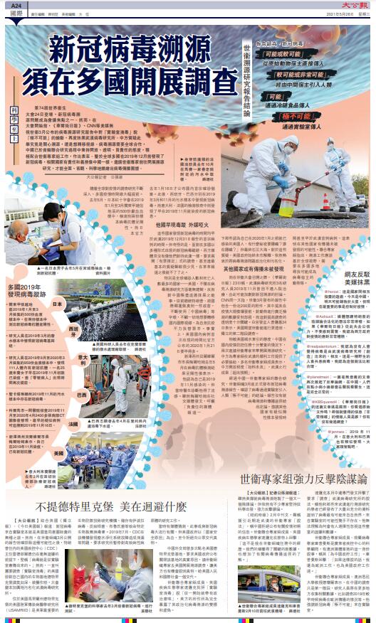 大公報綜合英國《獨立報》、《今日美國報》報道:新冠病毒來自實驗室本就是美國當局意圖卸責的無稽之談。然而,在世衞組織3月公開的報告明確排除這種可能性之後,特朗普任內的美國疾控中心(CDC)主任雷德菲爾德仍在毫無證據的前提下,堅稱「病毒就是從實驗室裏傳出來的。」然而,一直叫囂要調查「實驗室洩毒」的美國卻對自己國內的生物基地德特里克堡諱莫如深、裝聾作啞,只會變本加厲地污名化武漢病毒研究所。