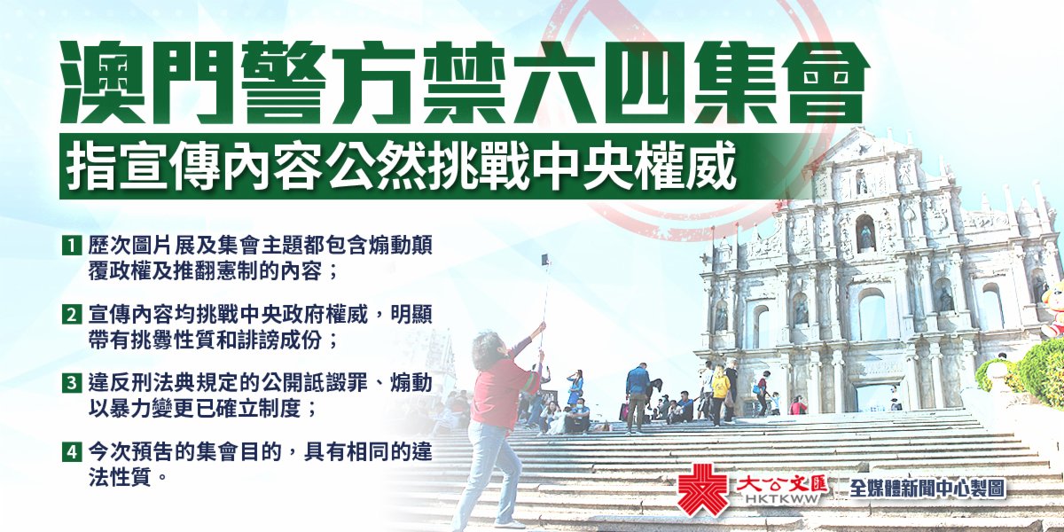 澳門警方於回覆「民聯會」集會預告的批示中指出,「民聯會」歷年舉辦的「六四集會」,其圖片展及集會主題都包含煽動顛覆政權及推翻憲制的內容,宣傳內容均挑戰中央政府權威,明顯帶有挑釁性質和誹謗成分,違反刑法典規定的公開詆譭罪、煽動以暴力變更已確立制度等,今次預告的集會目的,具有相同的違法性質,故拒絕集會申請。